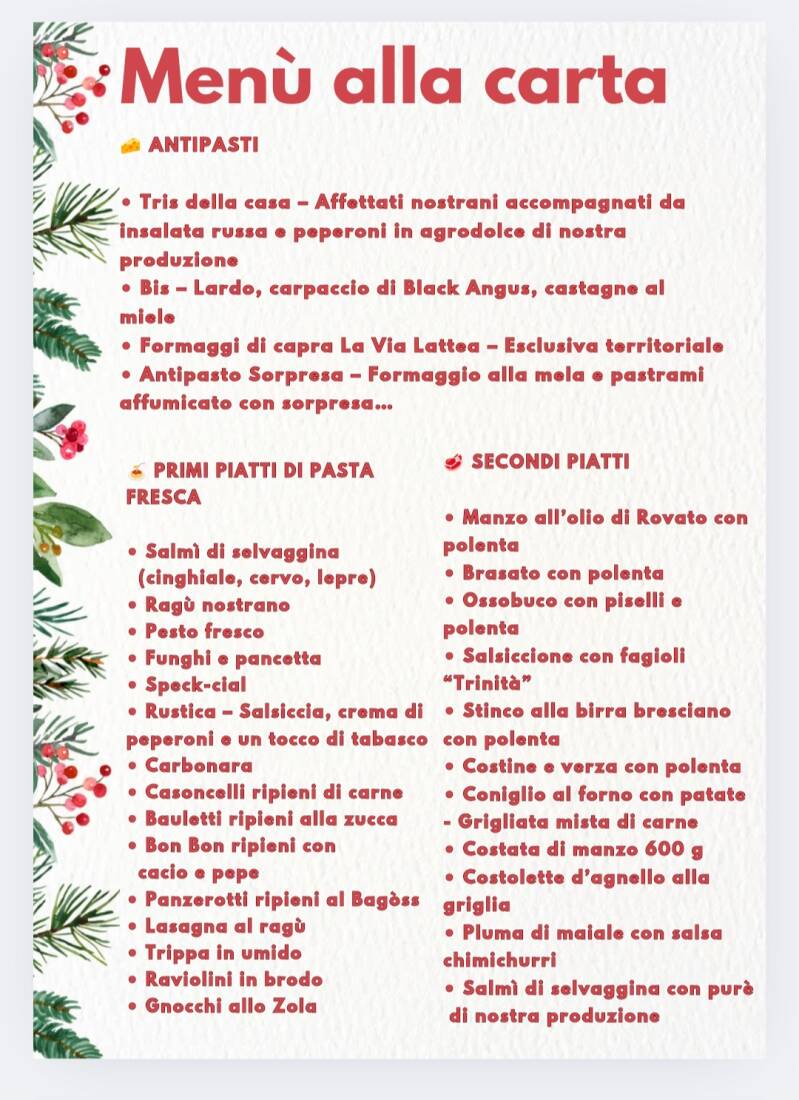 Nessun vincolo, solo gusto! assapora l'autentica cucina lombarda con il nostro menù alla carta completo. dalle specialità tradizionali ai piatti fatti in casa, ogni boccone è un'esplosione di sapori. festeggia senza limiti, mangiando ciò che desideri e spendendo come vuoi tu. ideale per chi cerca una cena o un pranzo di natale e capodanno all'insegna della libertà e della qualità.